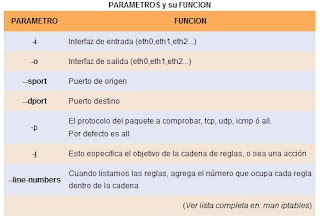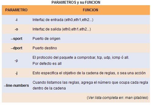 Parámetros Todas las reglas en iptables tienen definida su condición por los parámetros, que constituyen su parte primordial. Algunos de estos parámetros son: